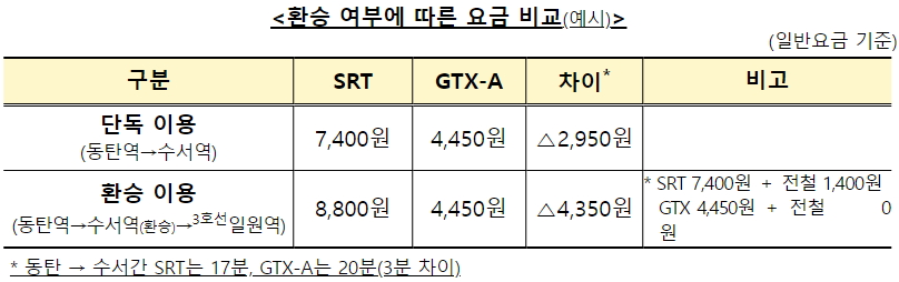 GTX 요금의 가장 큰 특징은 준고속 열차임에도 불구하고, SRT와 달리 수도권(서울시·인천시·경기도) 버스·전철과 GTX를 갈아탈 때 기본요금을 중복해서 추가로 내지 않아도 되는 환승 할인이 적용된다는 점이다.